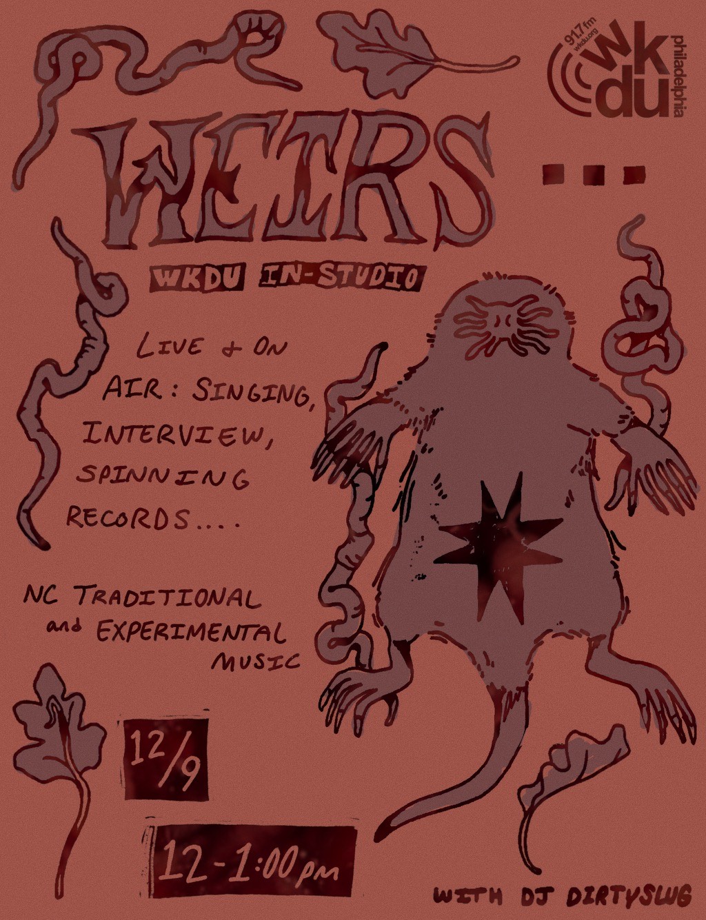 Weirs is an experimental collective grown out of central North Carolina’s music scene––one that is equal parts old-time and DIY noise. Non-hierarchical in form, past Weirs performances have included anywhere from two to twelve people. Instrumentation ranges from an antique pedal-organ, mandolins and fiddles to tape loops and vocoders. Their most recent album, Diamond Grove, released with Philly's own Dear Life Records, gained critical acclaim from Pitchfork, Stereogum, and folk freaks arcoss the globe.
